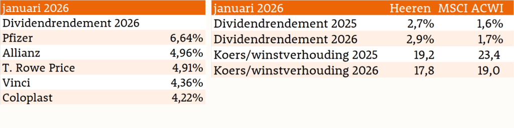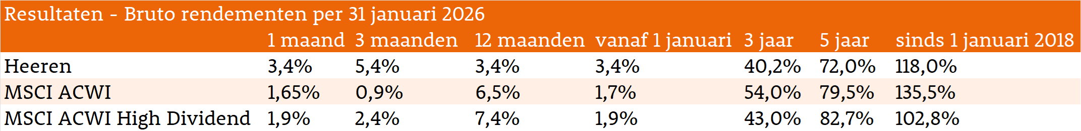 Regionaal gezien presteerden de opkomende markten het best met een stijging van 7,5%. Europa volgde met +3,1%, terwijl de MSCI Noord‑Amerika Index per saldo licht daalde met 0,03%. Onze portefeuille heeft een hogere weging in Europa dan de MSCI All Countries World Index, waardoor het rendement in januari uitkwam op 3,4%.