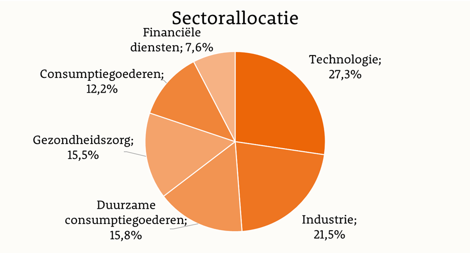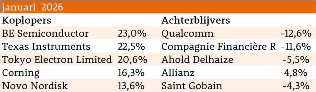 De best presterende sector was energie (+10,3%), ondersteund door een stijging van de olieprijs met ruim 10% als gevolg van oplopende spanningen tussen de VS en Iran. Ook basismaterialen profiteerden (+8,4%). Binnen technologie presteerden vooral halfgeleiders sterk. Aandelen als BE Semiconductor en Tokyo Electron stegen fors, terwijl de brede technologiesector licht daalde. Naast de hogere Europese weging was met name de aandelenkeuze binnen technologie bepalend voor de outperformance van de portefeuille.