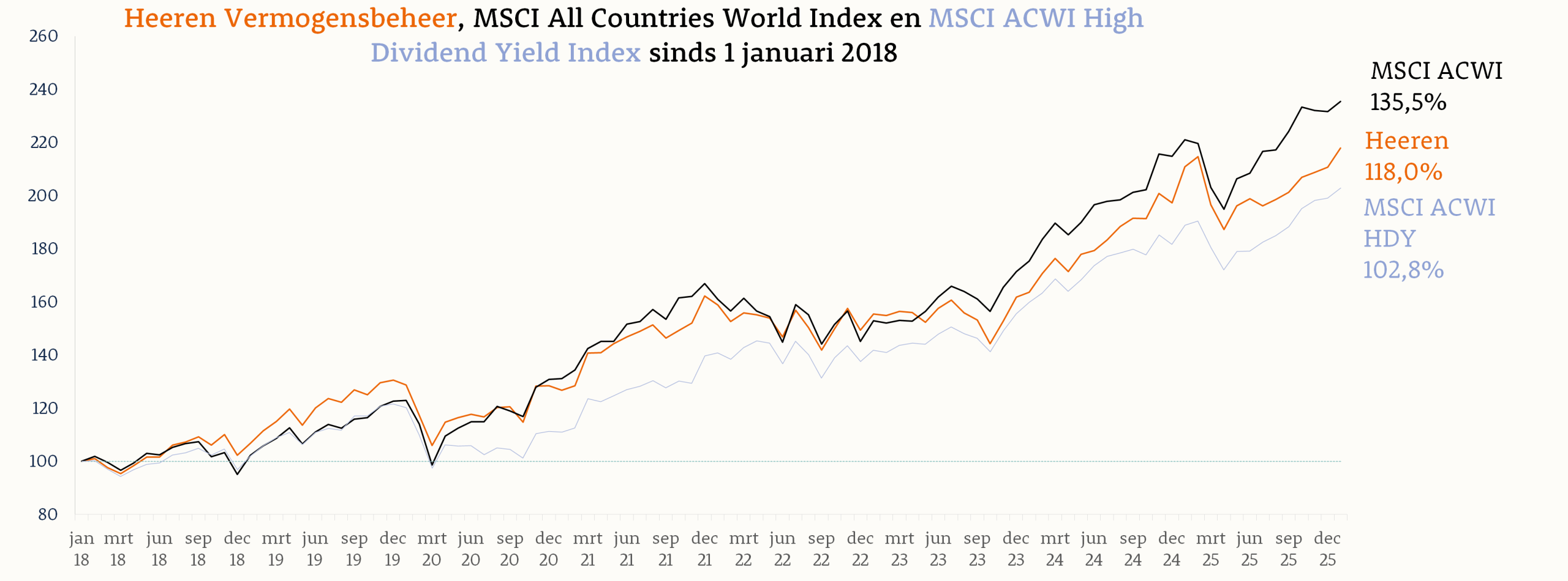 Wij geloven dat actief beleggen loont. Dat onze kennis en ervaring, onze gedegen analyses en onze consistente stijl daadwerkelijk resultaat oplevert voor uw vermogen. Met onze bewezen aanpak streven we naar een fijne samenwerking en aantrekkelijke rendementen voor u. Als specialist in dividendbeleggen selecteren wij hoogwaardige aandelen met een sterk dividend en dit is waar wij het verschil maken. Met onze langetermijnaanpak geniet u van stabiele vermogensgroei en een groeiend jaarinkomen, terwijl wij de dagelijkse marktbewegingen voor u in de gaten houden.