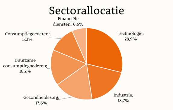 Wanneer technologie het voortouw neemt, is dat vaak een teken dat beleggers meer risico durven te nemen. Die risicobereidheid werd deze maand versterkt door een renteverlaging in de Verenigde Staten. Tegelijkertijd bleven meer defensieve sectoren achter: consumptiegoederen daalden met 2,2% en gezondheidszorg liet slechts een bescheiden winst van 0,6% zien. Onze portefeuille steeg in deze context met 1,3%.