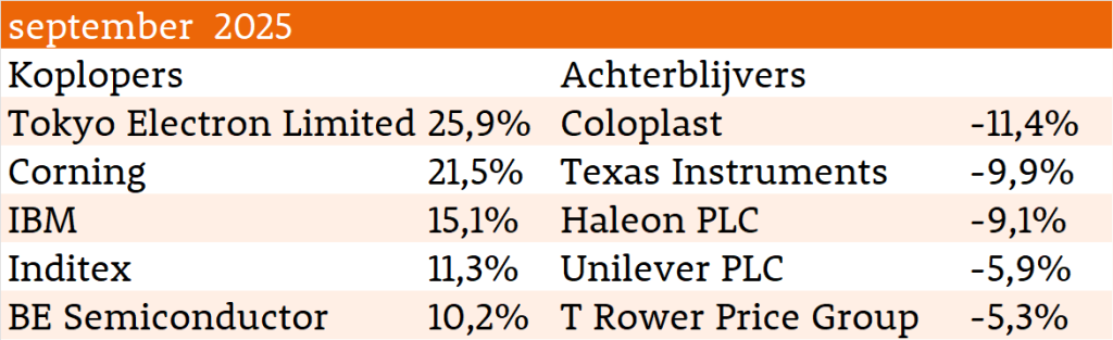 Wanneer technologie het voortouw neemt, is dat vaak een teken dat beleggers meer risico durven te nemen. Die risicobereidheid werd deze maand versterkt door een renteverlaging in de Verenigde Staten. Tegelijkertijd bleven meer defensieve sectoren achter: consumptiegoederen daalden met 2,2% en gezondheidszorg liet slechts een bescheiden winst van 0,6% zien. Onze portefeuille steeg in deze context met 1,3%.