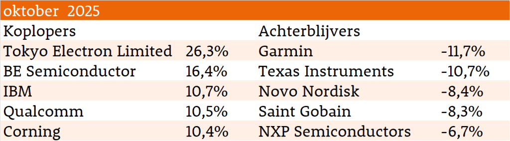 Andere sterke prestaties kwamen ook uit de halfgeleidersector. Het Nederlandse BESI steeg met 16,4%, waarbij de grootste sprong van 12,3% op één dag plaatsvond toen AMD een deal aankondigde met OpenAI. AMD maakt chips die gebruikmaken van hybrid bonding, een technologie waarin BESI vooroploopt. Ook Qualcomm (+10,5%) viel op met de introductie van twee nieuwe AI-chips om de concurrentie met Nvidia en AMD aan te gaan. Opvallend genoeg waren er ook dalers in dezelfde sector: Texas Instruments daalde met 10,7% en NXP Semiconductors met 6,7%. Beide bedrijven zijn meer gericht op chips voor de automobielsector, die het nog steeds zwaar heeft.