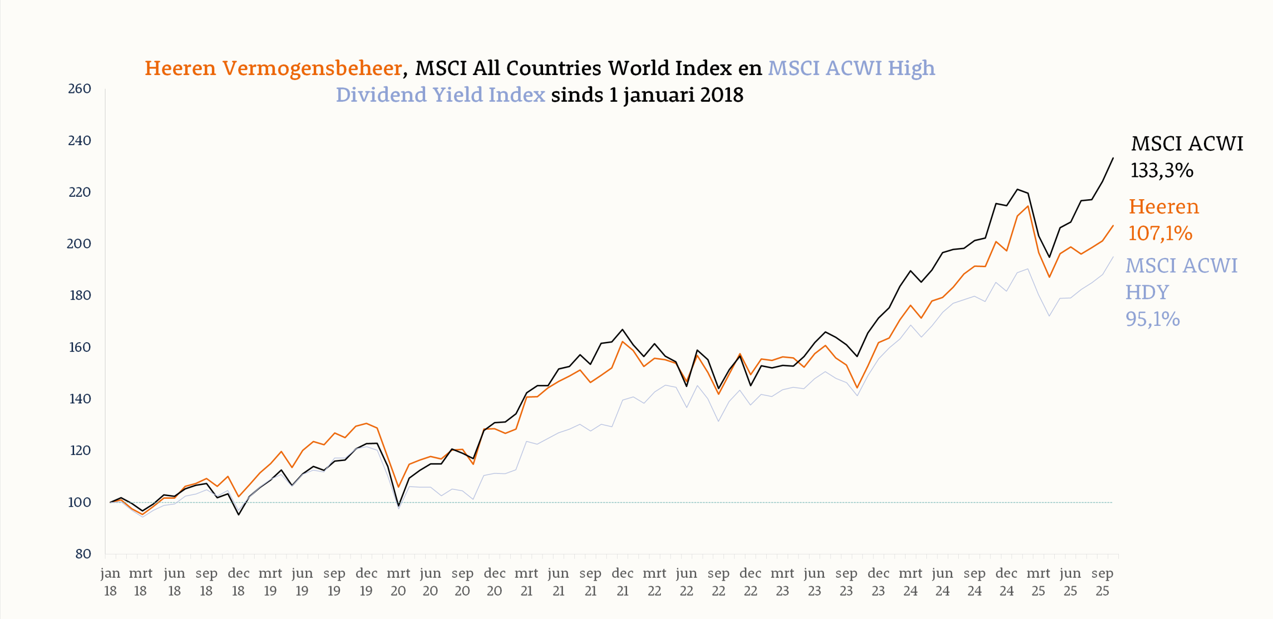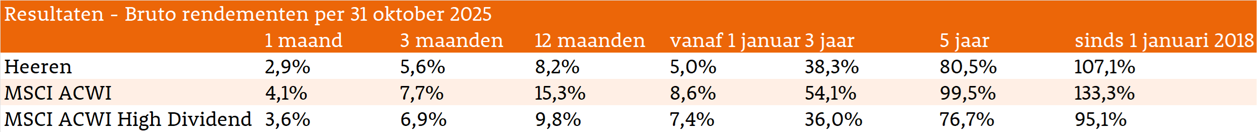 In oktober bepaalden de AI-gerelateerde aandelen uiteindelijk toch weer de trend op de aandelenmarkten. In het begin van de maand zorgden de achterblijvers voor een stijging van de indices, maar aan het einde van de maand zagen we het bekende plaatje terugkeren. De usual suspects zorgden voor de grootste stijging, al waren de achterblijvers ook gestegen. De MSCI All Countries World Index steeg met 4,1%, terwijl de portefeuille van Heeren een rendement van 2,9% boekte.